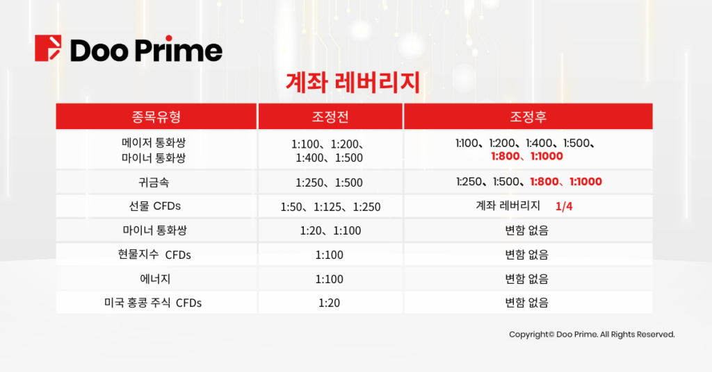 2022년11월19일 Doo Prime은 공식적으로 모든 계정 유형의 선택 가능한 레버리지를 1:500에서 1:1000배로 상향 조정하여 더 다양한 레버리지 옵션을 제공하여 전 세계 고객님들께서 적은 자본으로 더 높은 이익을 취할 수 있는 기회를 제공합니다.