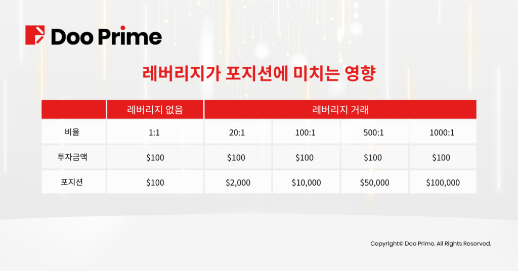 가정: Doo Prime에서 레버리지 1000으로 USD 100,000를 거래한다면 USD100 로 거래가 가능합니다.