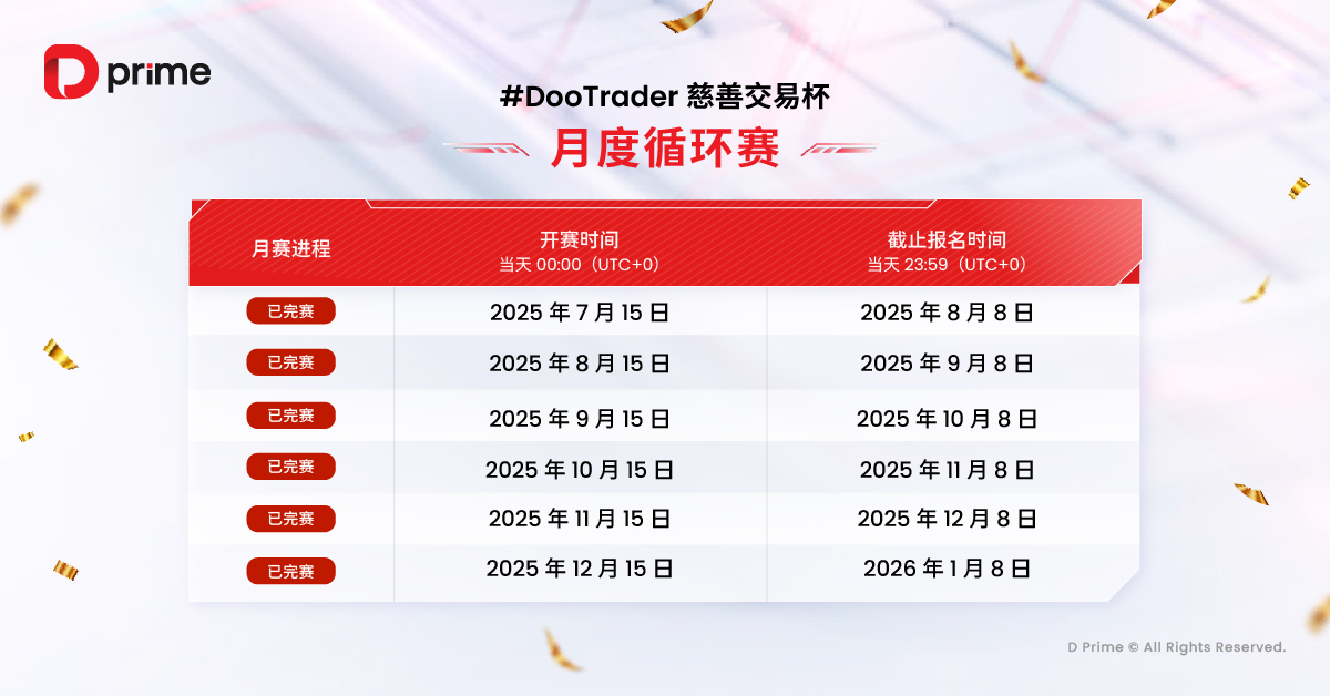 D Prime #DooTrader 자선 트레이딩 제6라운드 월간 대회가 1월 14일 23:59(UTC+0) 기준으로 성황리에 막을 내리며 치열했던 결과 랭킹이 공개되었습니다! 반년에 걸친 치열한 경쟁 끝에 6차례의 월간 대회가 모두 마무리되었으며 대회는 이제 서바이벌 아일랜드 최종 결전 단계로 공식 진입했습니다!