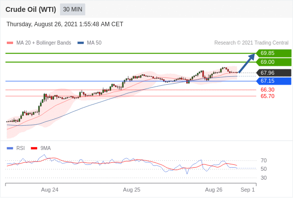 在 67.15 之上,看涨,目标价位为 69.00 ,然后为 69.85 。