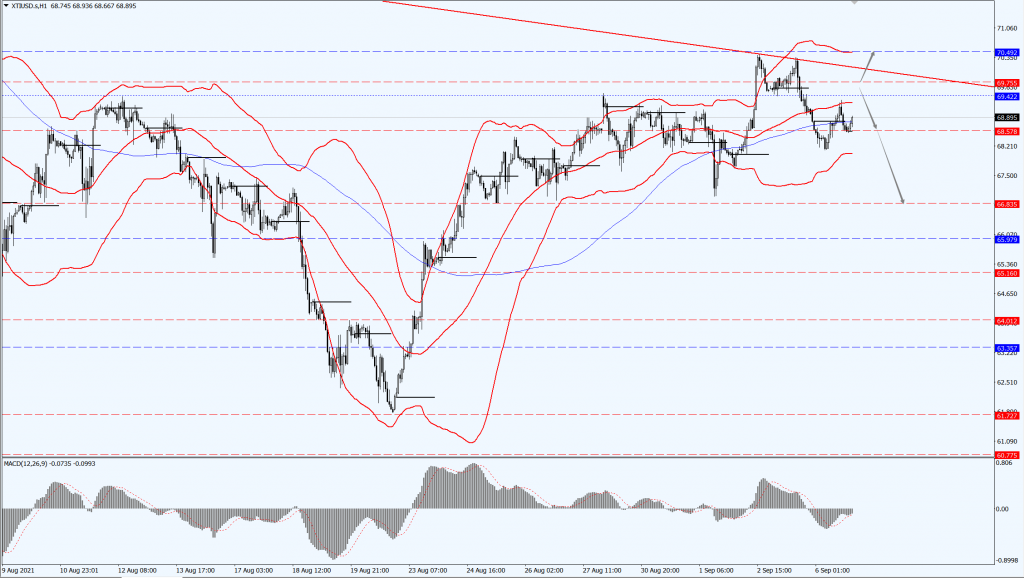 油价关注 69.75 一线,如果油价运行于 69.75 一线下方,则关注 68.57 和 66.83 两个位置的支撑力度;如果油价力度上破 69.75 一线,则将再次测试 70.49 一线的压制力度。