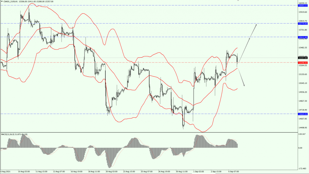 A50 今日依旧关注 15298 一线的支撑力度,只要 A50 稳定运行于 15298 一线上方,关注 15612 一线的压制力度;下方关注布林带中轨的支撑,只要不跌破布林带中轨,顺势看多;如果 A50 跌破布林带中轨,则下看布林带下轨的支撑力度。