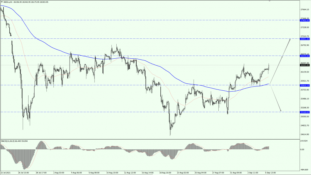 HK50 今日依旧关注 25816 一线的支撑力度,在 25816 一线上方,则依旧保持顺势看多的思路为主,上方关注 26535 和 26951 两个位置的压制力度;如果 HK50 跌破 25816 一线,则有再次测试 25160 一线支撑力度的可能。