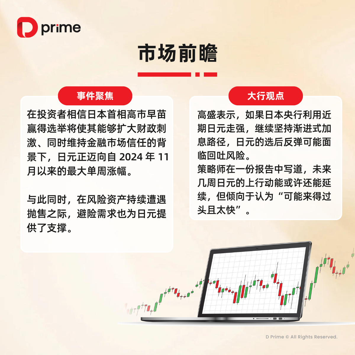 精选研报 | 上周,金价重新站上 5000 美元,美国 1 月核心 CPI 创近 5 年新低!与此同时,在风险资产持续遭遇抛售之际,避险需求也为日元提供了支撑。 本周,高盛表示,如果日本央行利用近期日圆走强,继续坚持渐进式加息路径,日圆可能面临回吐风险。还有哪些大事值得关注?下方图片速览:
