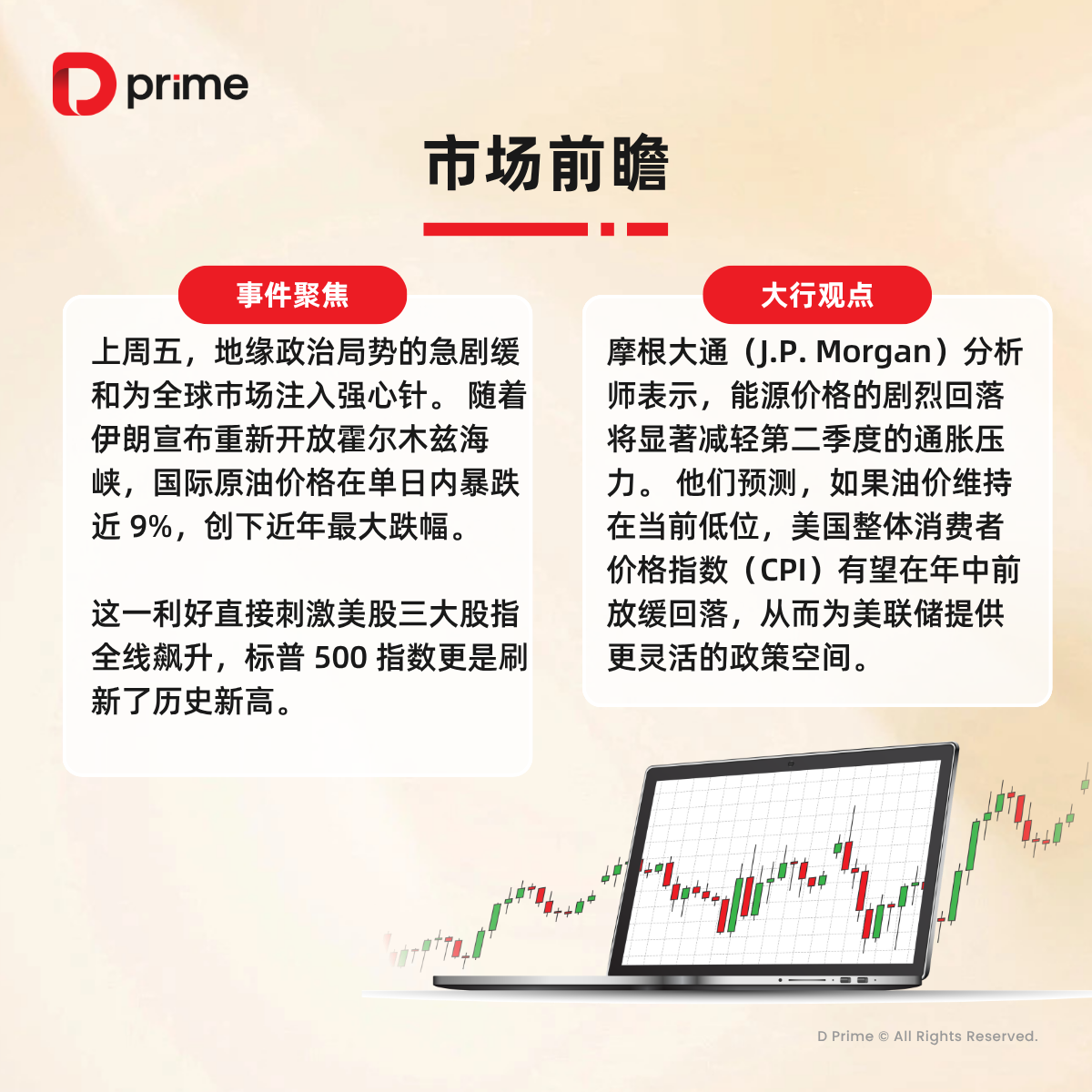 精选研报 | 上周五,标普首破 7100 点大关,纳指创 1992 年来最长连涨纪录,地缘政治局势的急剧缓和为全球市场注入强心针。摩根大通分析师表示,能源价格的剧烈回落将显著减轻第二季度的通胀压力。 还有哪些大事值得关注?下方图片速览: