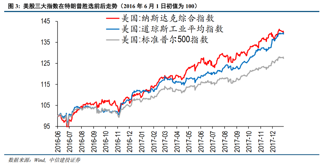 2016 年大选前,民调结果大多显示希拉里(Hillary Clinton)领先特朗普(Donald Trump),但最终败北。而比起总统大选结果的反转,更超乎市场预期的是共和党在参议院、众议院也获得多数,这意味着中期选举之前共和党推行政令的强大权力。资本市场对当时超预期结果作出反应,市场开始集中消化对特朗普的减税、关税等政策主张的影响。