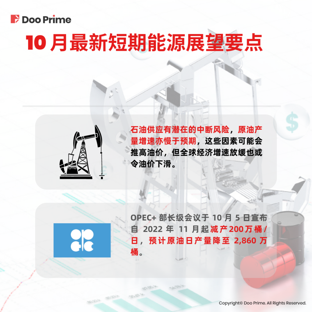 - 在 2022 年 10 月 5 日举行的OPEC+ 部长级会议中,各成员国达成自 2022 年 11 月起减产200万桶/日的共识。据此,OPEC+ 预测,2022 年第四季度和 2023 年第一季度,欧佩克原油日产量将从 2022 年 9 月的平均 2,960 万桶下降至 2,860 万桶。