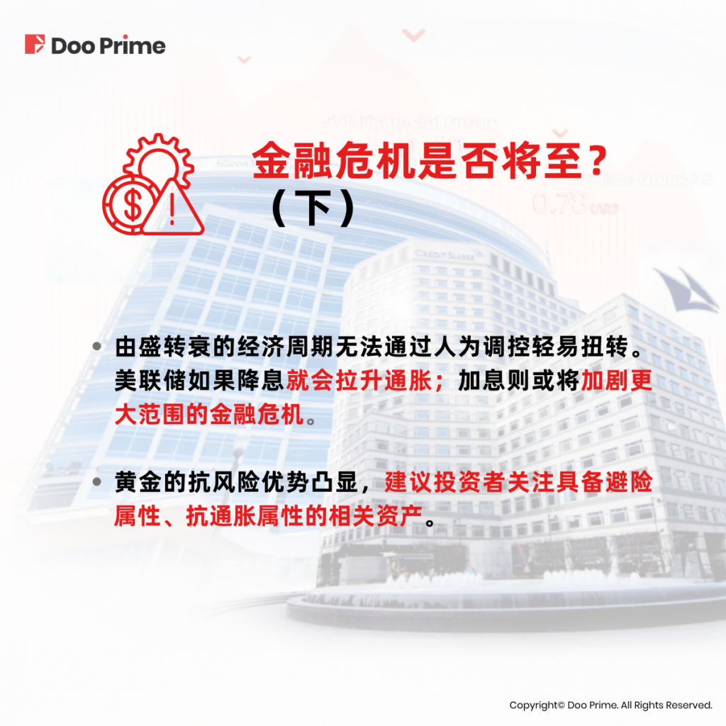 总之,对于美联储和欧洲央行而言,面对当前的危机如果选择继续加息,那么无疑是继续加大危机出现的可能性。如果选择降息,那么无疑又是让之前为了压低通胀所做出的努力付之东流。在这种大环境下,黄金的抗风险优势凸显,因为如果加息,继而引爆危机,那么在恐慌情绪的刺激下黄金价格无疑将迎来上涨;而如果选择降息,那么通胀再度抬头,同样利好黄金这种大宗资产的价格。当前金融危机尚未全面爆发,但已然暗藏了潜在隐患。建议投资者关注具备避险属性、抗通胀属性的相关资产,这样无论危机是突然爆发,还是长期钝刀子割肉,投资者均能有备无患。