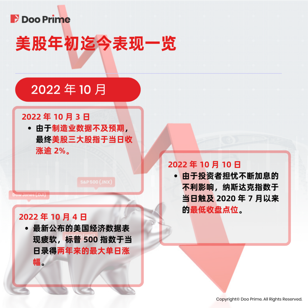 2022 年 10 月 3 日,由于制造业数据不及预期,导致市场认为美联储或减缓激进加息的步伐,引发美债收益率大幅下降,最终美股三大股指于当日收涨逾 2%。