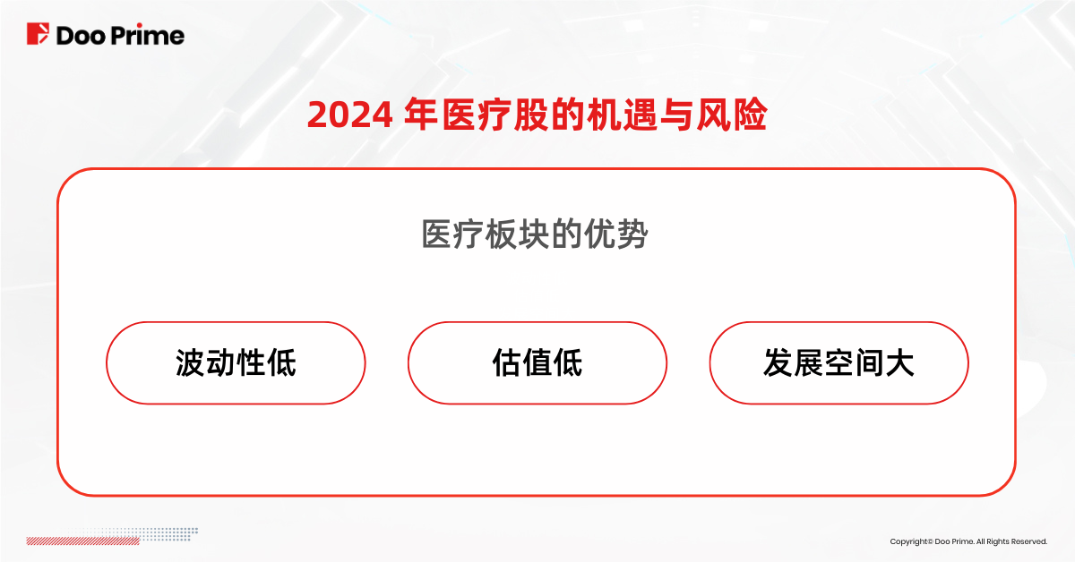 在 2024 年,股市中的医疗板块预计将趁着减肥药和 AI 的热潮进一步上涨。由于目前医疗股估值偏低,而且发展空间巨大,叠加医疗股本身波动性低的特质,对投资者而言,将会是防御性股票的最佳选择之一。然而,投资者需要意识到,凡事都有一体两面,应密切留意美国大选之年的医疗政策是否会生变,而且在行业竞争激烈的情况下,医疗企业能否存活,并实现盈利。