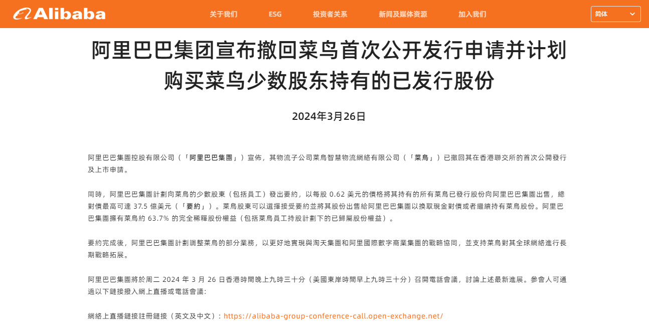 阿里巴巴集团公告,为更好加强与阿里电商业务协同,以及继续支持菜鸟扩大全球物流网络投入,已撤回在港交所的首次公开发行及上市申请。同时,阿里巴巴计划向菜鸟少数股东发出要约,以每股 0.62 美元的价格,将其持有的所有菜鸟已发行股份向阿里巴巴集团出售,总对价最高可达 37.5 亿美元(约合 270.69 亿元人民币)。