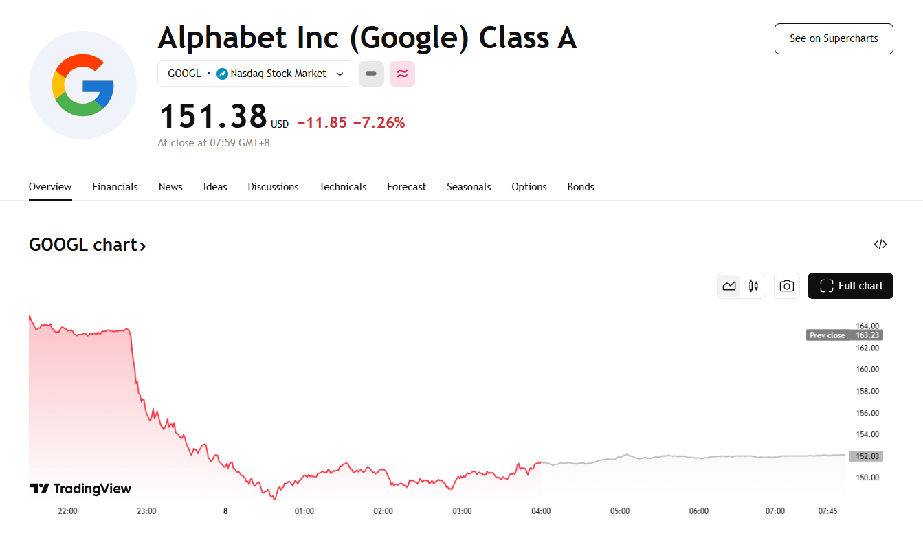 美股盘中,谷歌母公司 Alphabet 股价跌幅迅速扩大,一度跌超 9%,随后略微收窄跌幅,收跌近 7.3%,收报 151.38 美元;苹果股价日内转跌,盘中跌幅超过 2%。谷歌和苹果的下挫,令美股大盘走低,纳指 100 盘中转跌。
