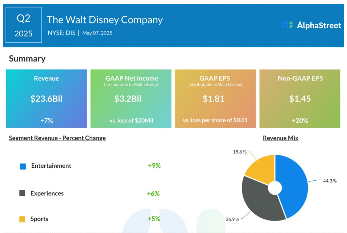 5 月 7 日美股盘前,受益于主题公园和流媒体业务的强劲表现,迪士尼第二财季营收、利润双双超出预期,公司大幅上调全年盈利指引。