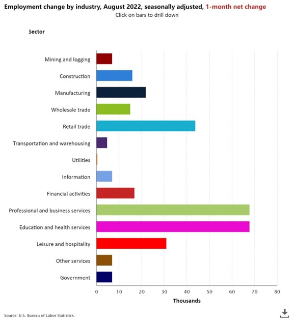 北京时间 9 月 2 日晚 20 点 30 分,美国劳工部公布的 8 月非农就业人数增加 31.5 万人,创 2021 年 4 月以来最小增幅,高于市场预计的 30 万人,较前值的 52.8 万人大幅回落,显著的就业人数增长主要在专业和商业服务、医疗保健和零售贸易。