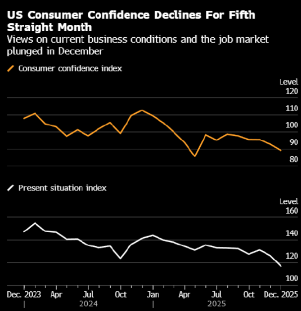 报告指出,高企的物价水平及就业市场的放缓贯穿全年,持续压制消费者的经济预期,使信心指数维持在疫情以来的低位区间。分析人士认为,若薪资增长未能明显加速或物价压力延续,消费动能可能继续受限,对美国经济增长构成挑战。