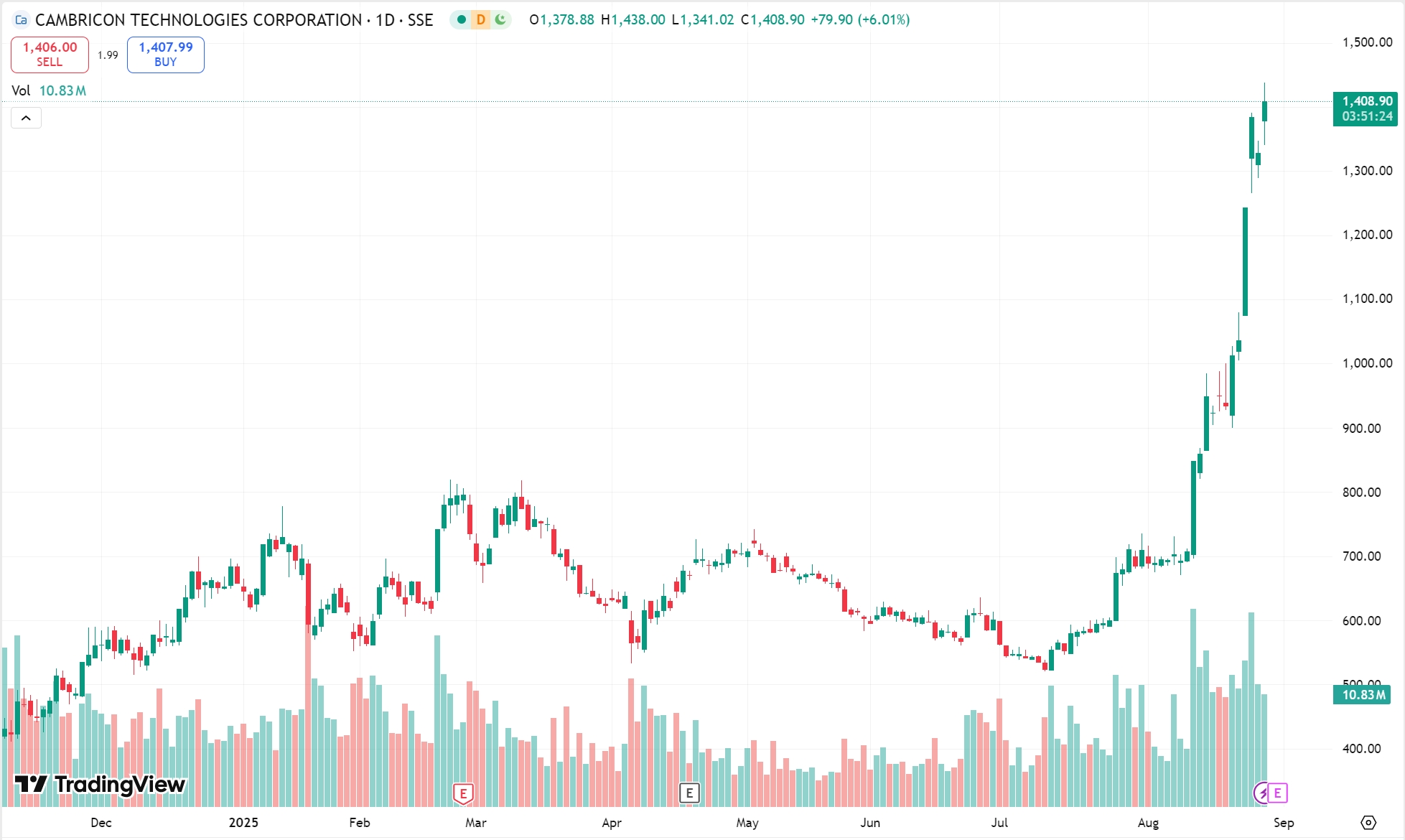 行业动态 | 寒武纪业绩爆发,上半年营收飙升 43 倍!股价突破 1400 元