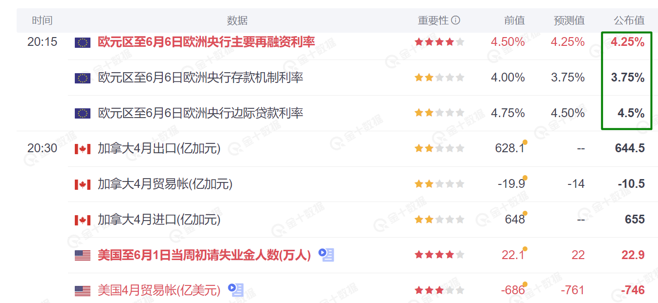 继加拿大央行之后,欧洲央行公布 6 月利率决议,一如预期降息 25 个基点,将主要再融资利率、边际贷款利率和存款机制利率分别下调至 4.25%、4.50% 和 3.75%,为 2019 年以来首次降息,也是 G7 成员国中第二个降息的央行。