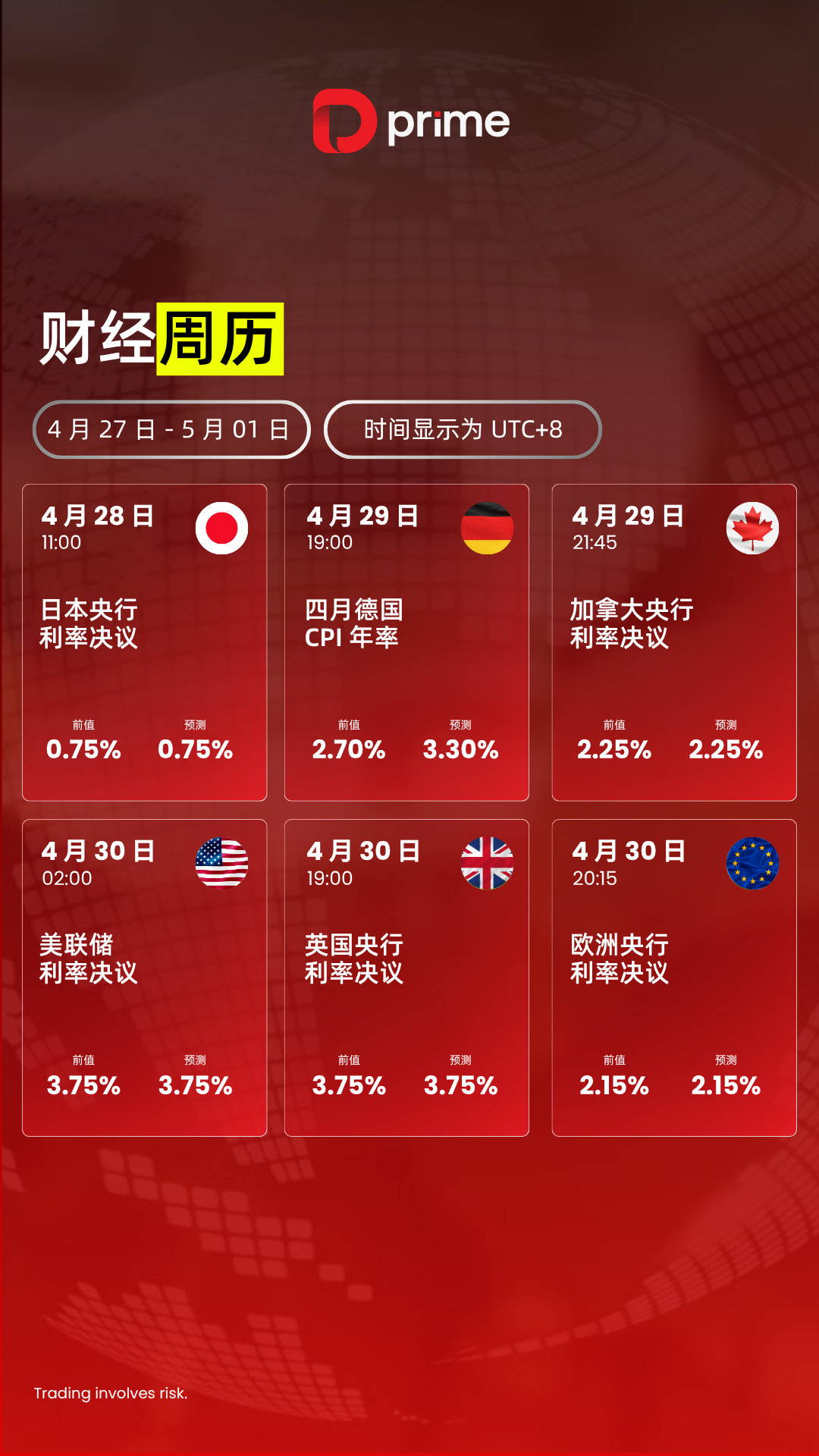财经日历 | 以下为 2026 年 4 月 27 日至 2026 年 5 月 01 日(GMT+8 北京时间) 全球重大经济事件提醒。在重大行情期间,请确保您已审查您的保证金率,并有足够的保证金来支撑您的风险敞口。