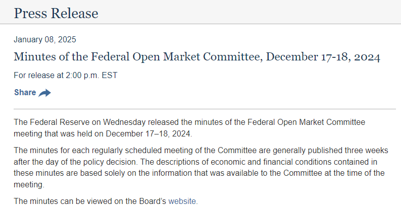 8 日,美联储公布去年 12 月 FOMC 政策会议纪要,联储官员表达了对通胀高于预期和特朗普上台后政策可能带来通胀影响的担忧,暗示他们或出于未来的不确定性而放慢降息的脚步。