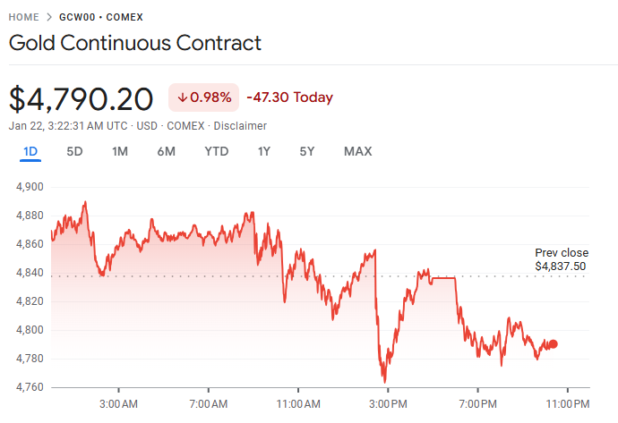受消息影响,金价自盘中高点回落。此前现货黄金最高曾触及每盎司 4,888.42 美元的历史新高,随后涨势放缓。