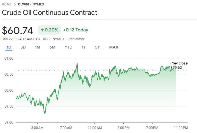 WTI 原油价格攀升不到 1%,收于每桶 61 美元下方,走势与美股和美元同步。特朗普此前表示,将不会执行针对反对美国接管格陵兰的欧洲国家所威胁征收的关税,这一转变缓解了部分贸易紧张情绪。