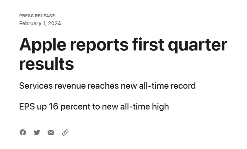 苹果公布 2024 财年第一季财报显示,季度收入在一年来首次增长,EPS 和服务收入均创新高,iPhone 销量好于预期,且预计 3 月份季度继续增长,但大中华区疲软表现坐实华尔街对 iPhone 遭遇激烈竞争的销量担忧。