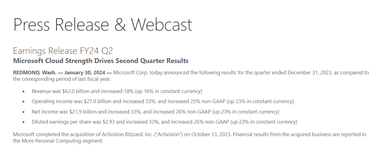 科技巨头微软发布了 2024 财年第二财季(2023 自然年四季度)财报,也是完成收购动视暴雪以来的首份财报。截至 12 月 31 日,微软当季总营收增长 18% 至 620 亿美元,连续 5 个季度创下历史新高,高于预期的 611 亿美元;每股收益为 2.93 美元,同比增长 33%,同样高于预期的 2.78 美元。