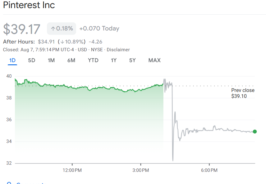 受盈利表现不及预期及用户增长停滞影响,Pinterest 盘后股价一度下跌 16%。