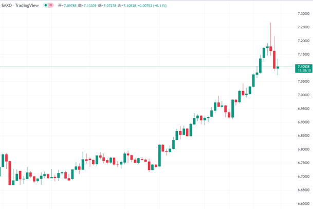 北京时间 9 月 29 日(周四)7 时 25 分左右,离岸人民币暴涨,人民币兑美元在极短的时间内涨幅达 860 点。短短四小时内,即北京时间 29 日 22 时 30 分后,自当日美元兑人民币的最高点算起,人民币飙升了 1000 点,日内最大反弹幅度也超过 1100 点。从 28 日创下的美元兑人民币短期高位 7.2673 算起, 人民币最大飙升幅度更是高达 1600 点以上。截至北京时间 30 日(周五)7 时 57 分,离岸人民币兑美元报 7.0977,较周三纽约尾盘涨超 640 点。