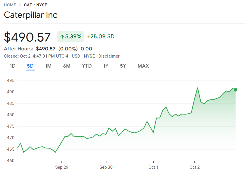 受人工智能热潮带动,美国数据中心电力需求快速上升,意外令重型工业设备龙头 Caterpillar(CAT) 成为最大受益者。其股价 9 月单月飙升 14%,年内累计上涨 32%,表现远超 纳斯达克 100 指数 及多家科技巨头。