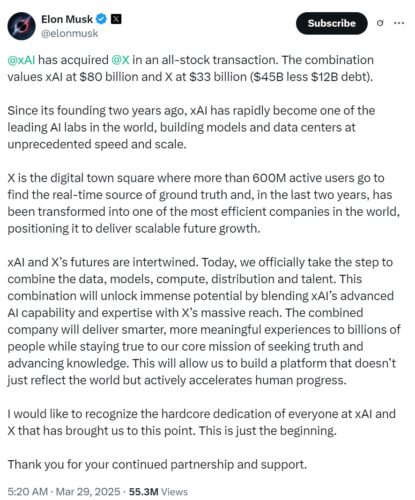 马斯克宣布 xAI 收购 X,合并估值超 1000 亿美元