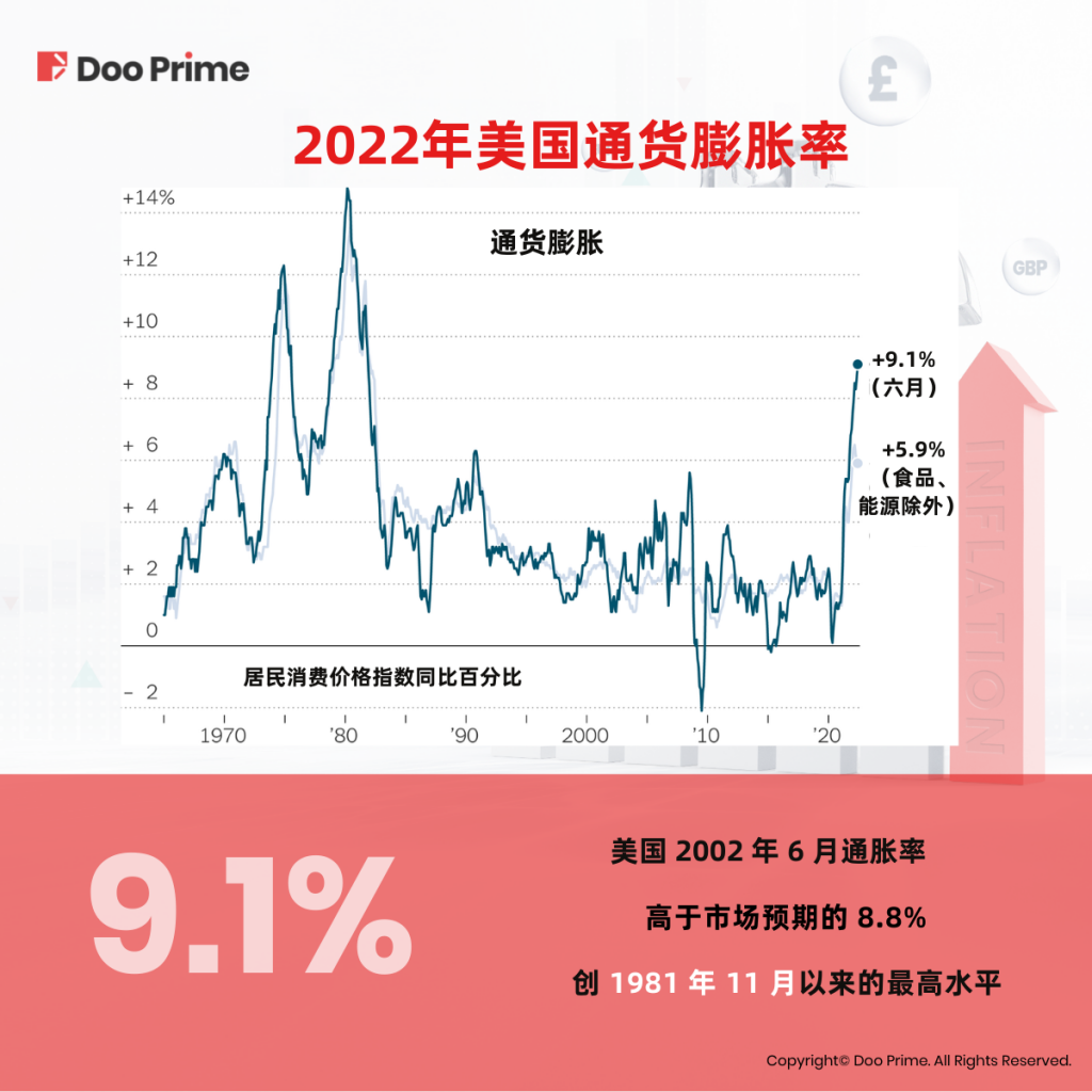 根据美国劳工统计局(Bureau of Labor Statistics)的报告,在 2022 年 6 月,美国年通胀率从 5 月的 8.6% 攀升至 9.1%,高于此前市场一致预期的 8.8%。这是自 1981 年 11 月以来的最高水平,也是世界上最高的通胀率之一。