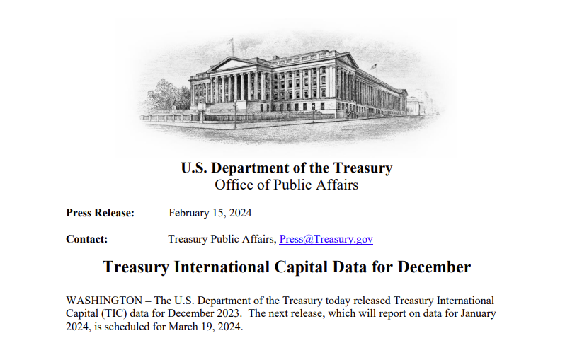 同日,美国财政部公布 2023 年 12 月国际资本流动报告(TIC),数据显示 12 月日本持有美国国债 1.1382 万亿美元,总持仓创 2022 年 8 月以来新高,环比增加了 107 亿美元;12 月中国的美债持仓高达 8163 亿美元,环比增加 343 亿美元,在美国以外国家地区中仍稳居次席。