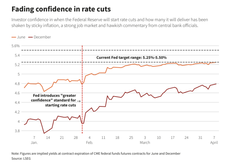 伦敦证交所集团(LSEG)的数据显示,在美国经济持续走强的情况下,期货交易者对美联储今年降息幅度的押注已降至去年 10 月以来最低水平。8 日,美联储基金期货 12 月合约显示,今年的降息预期约为 60 个基点,而 2024 年初的降息预期约为 150 个基点。