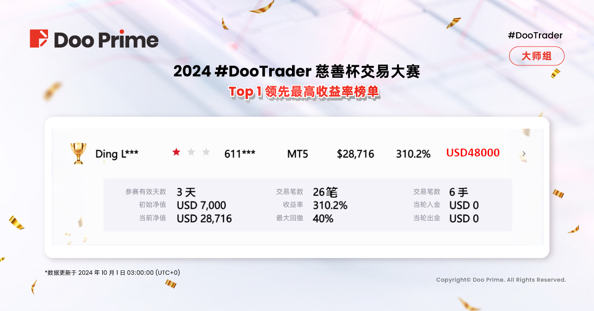在 2024 #DooTrader 9 月大赛中,大师组第一名 Ding L*** 在成功报名参赛之后,直到 9 月 24 日才开始交易。这位选手当天分别分别操作了两笔 XAUUSD 订单,总计交易 6 手。隔夜平仓后,他一举斩获 21,000 美元的利润,凭借高达 310% 的收益率,截至 10 月 1 日稳稳占据排行榜首位。