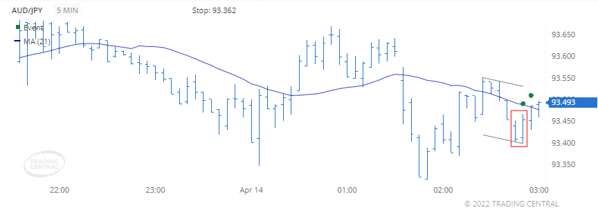 We found a pattern called Inside Bar (Bullish) on 2022 Apr 14 at 02:50 GMT on a 5 minute chart suggesting the outlook is bullish for up to 12 hours.