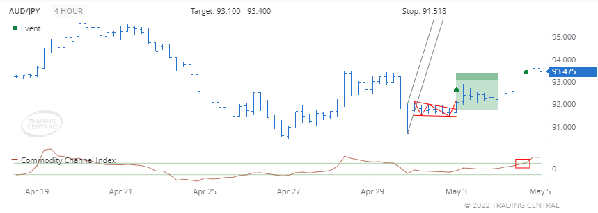 We found a pattern called Flag (Bullish) on 2022 May 03 at 01:00 GMT on a 4 hour chart, providing a target price for up to 48 hours in the range of 93.100 to 93.400.
