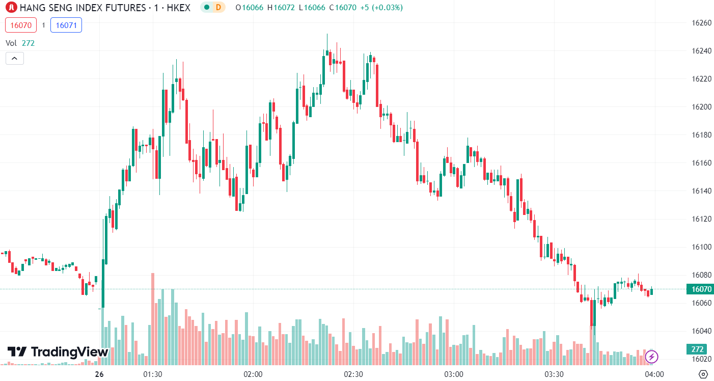 - Hang Seng Index (HSI) dropped by 0.94%, closing at 16,059.99 points.