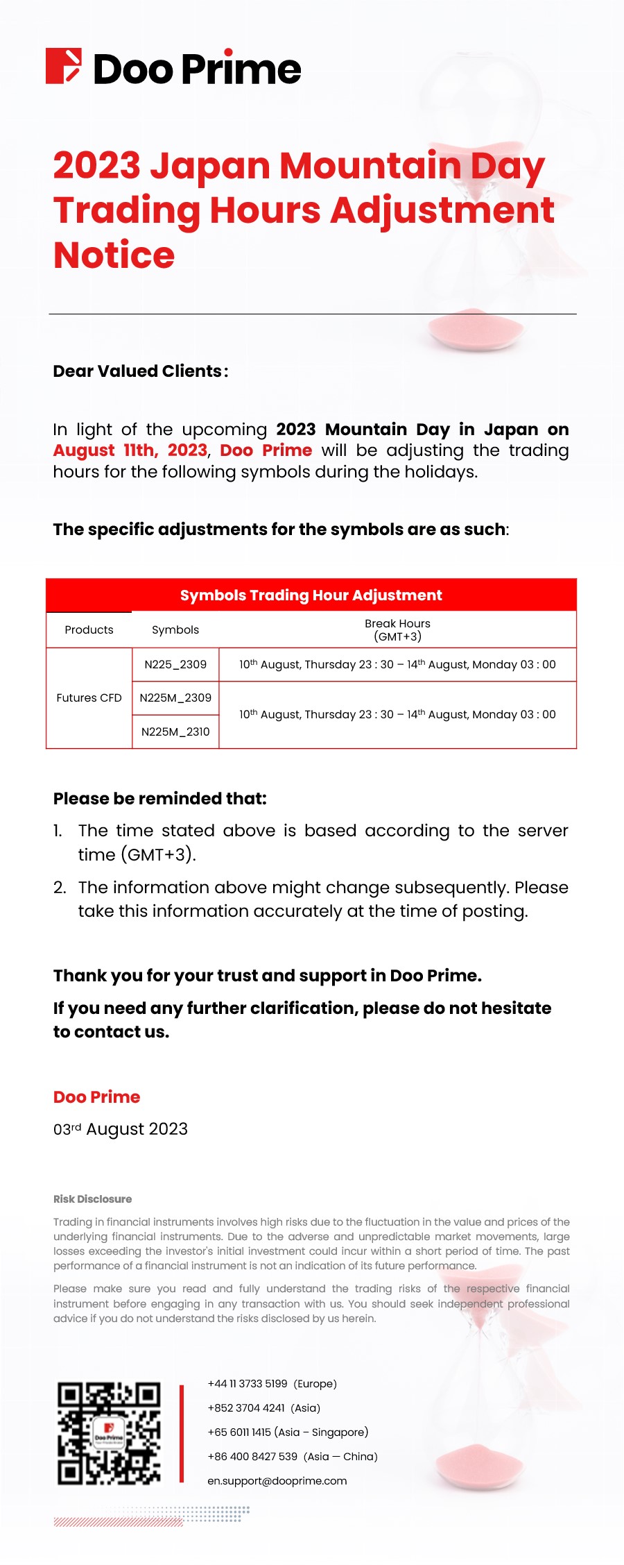 2023-08-03 | Holiday Hours , Trading Hours Adjustment