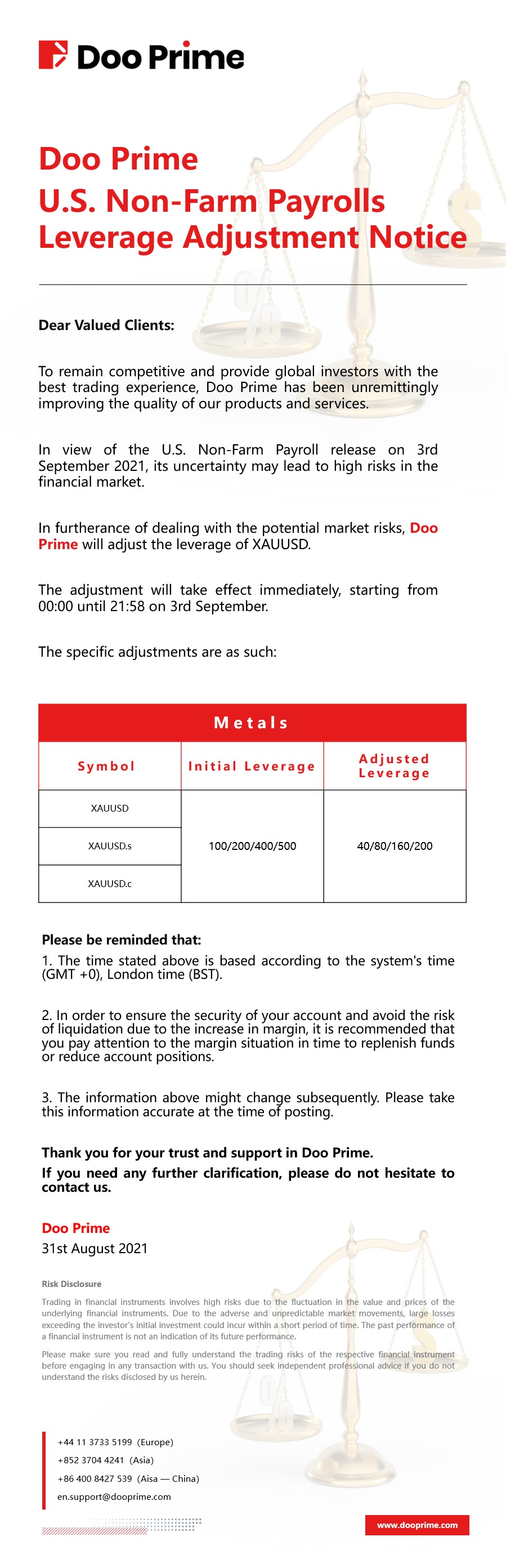 2021-08-31 | Leverage Adjustment Notice , US Non-Farm Payrolls Leverage Adjustment Notice