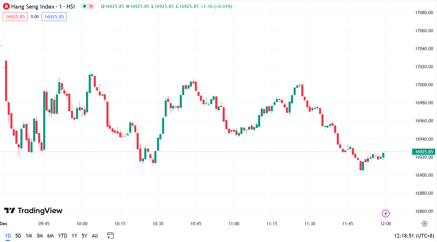 - Hang Seng Index (HSI) dropped by 0.69%, closing at 16,925.85 points.
