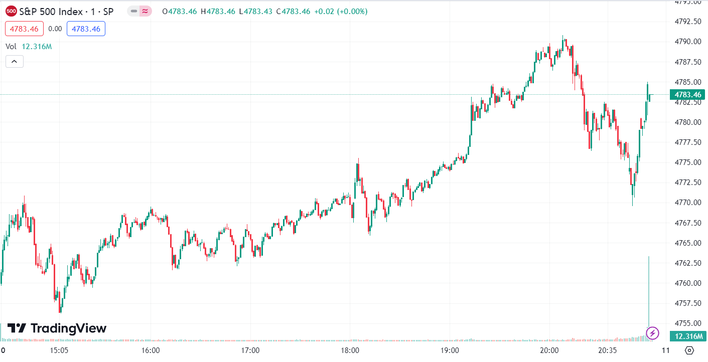 - S&P 500 Index increased by 26.95 points, a 0.57% rise, closing at 4,783.45 points.