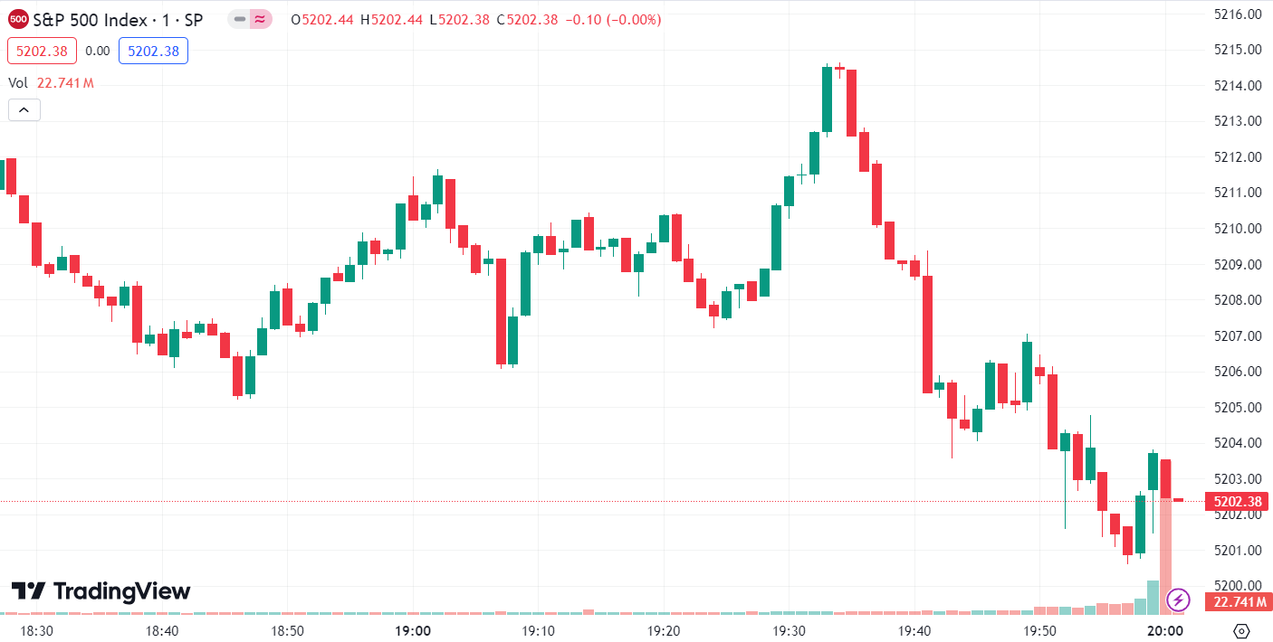 • S&P 500 Index dropped 1.95 points, a 0.04% decrease, to 5,202.39.