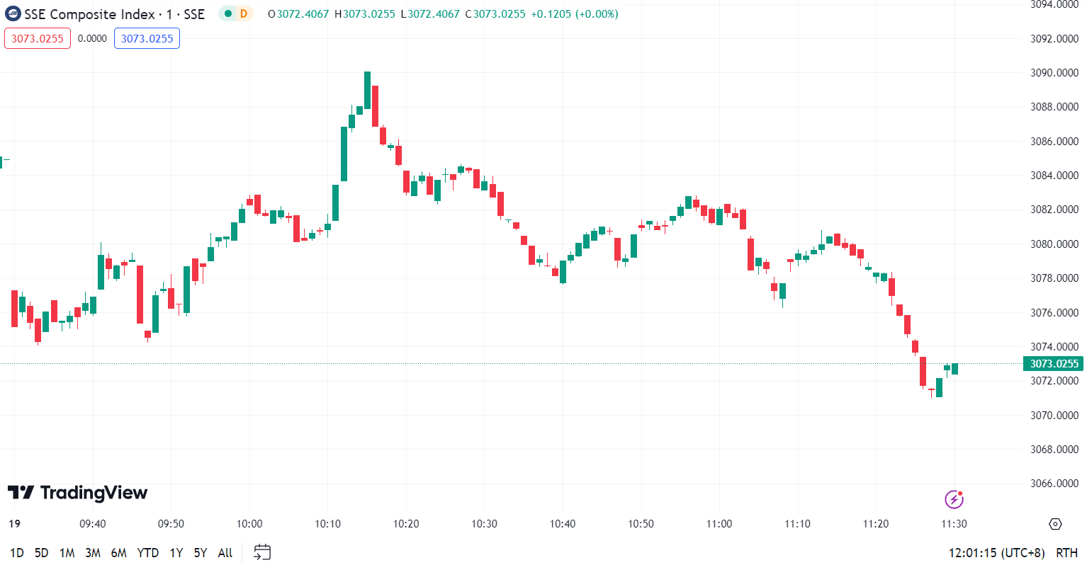- Shanghai Composite Index (SHCOMP) fell by 0.9% to close at 3,073.03 points.