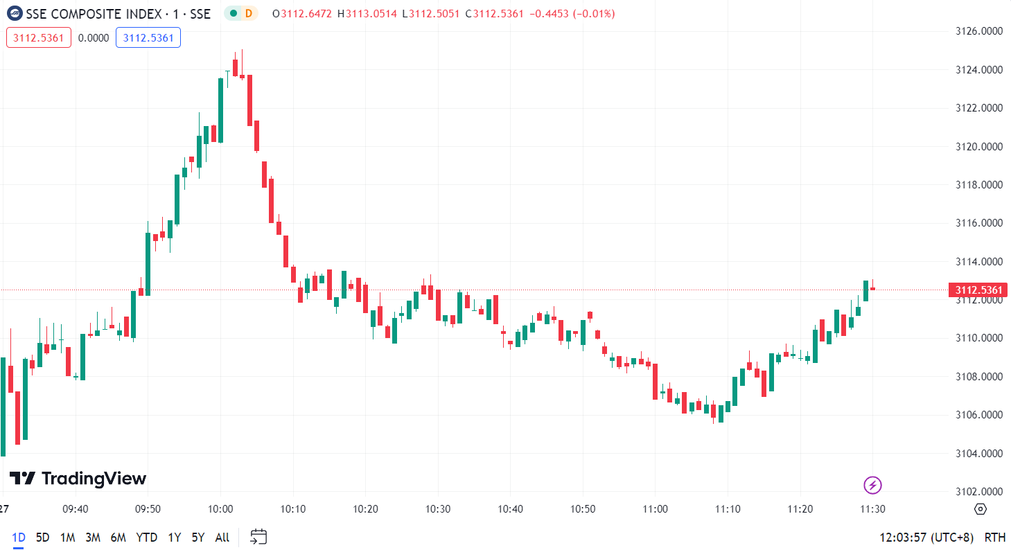 - Shanghai Composite Index (SHCOMP) rose by 0.33%, closing at 3,112.54 points.