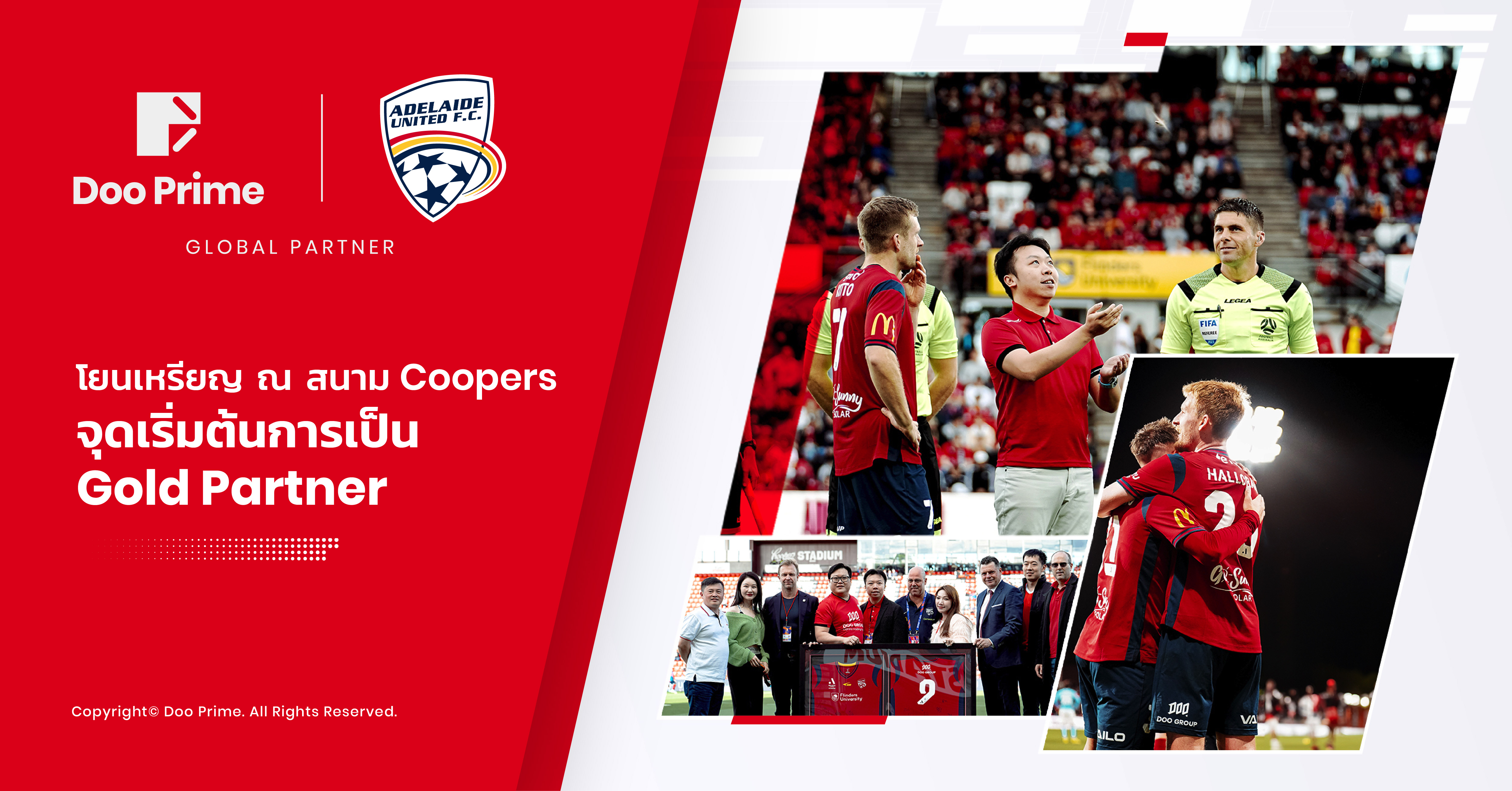 เพื่อเฉลิมฉลองความร่วมมือครั้งนี้ Doo Group และ AUFC ได้เริ่มกิจกรรมเปิดตัว Gold Global Partnership โอกาสสำคัญดังกล่าวประกอบด้วยกิจกรรมต่างๆ มากมาย รวมถึงการเที่ยวชมเมืองแอดิเลด การประชุมพาร์ทเนอร์ ทัวร์สนามกีฬา การแลกเปลี่ยนเสื้อพร้อมลายเซ็น และชมการแข่งขันวีไอพีสำหรับแขกรับเชิญของ Doo Group ทุกคน ไฮไลท์ที่สำคัญที่สุดคือเซสชั่นการโยนเหรียญ ซึ่งวินด์สัน ชาน ซีอีโอของเรา เป็นตัวแทนของ Doo Group ที่สนาม Coopers Stadium สำหรับเกม Isuzu UTE A-League Men ที่จัดขึ้นเมื่อวันที่ 29 ตุลาคม 2566