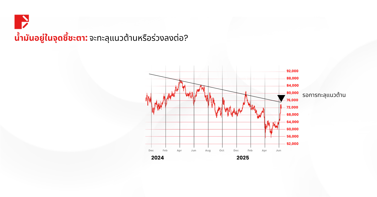 ในเชิงเทคนิค ราคาน้ำมันกำลังทดสอบเส้นแนวโน้มขาลงหลักที่ทำหน้าที่เป็นแนวต้านมาตั้งแต่ปี 2566 หากราคาสามารถเบรกทะลุเส้นนี้ได้อย่างชัดเจน ก็มีแนวโน้มจะพุ่งขึ้นไปแตะช่วง $90–100 ด้วยแรงหนุนจากโมเมนตัม