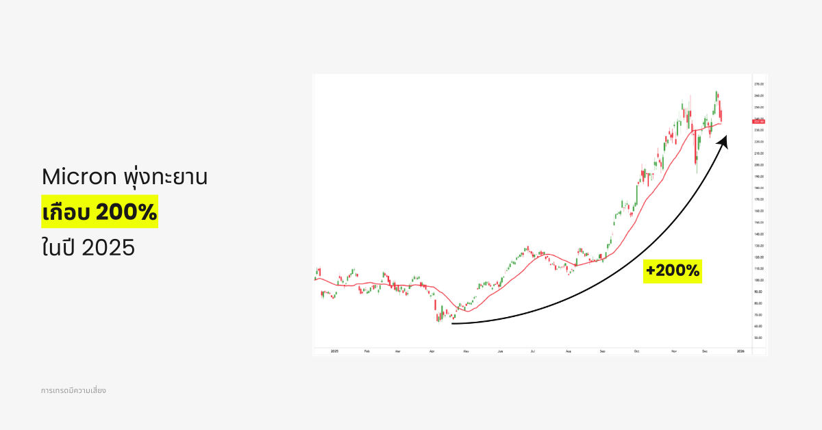 Micron (MU) พุ่งขึ้นราว 200% จากจุดต่ำสุดในปี 2025 ถือเป็นหนึ่งในหุ้นที่ทำผลงานได้ดีที่สุดในปีนั้น