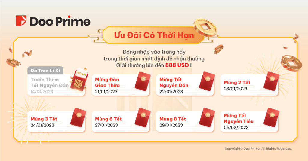 Trong năm 2022, Tập đoàn Doo Group đã ấp ủ chuỗi sự kiện tri ân khách hàng toàn cầu – những người đã lựa chọn ủng hộ và tin tưởng chúng tôi trong suốt thời gian qua. Năm 2023 sẽ là thời điểm mà chúng tôi cho ra mắt hàng loạt các chiến dịch cùng chương trình ưu đãi hấp dẫn cho các nhà đầu tư trên toàn thế giới. Cụ thể, trong năm Quý Mão, Doo Prime sẽ chính thức khởi động chương trình “Giveaway Toàn Cầu Nhân Dịp Tết Nguyên Đán” và nhiều ưu đãi có thời hạn, như một lời chúc năm mới đến quý khách hàng.