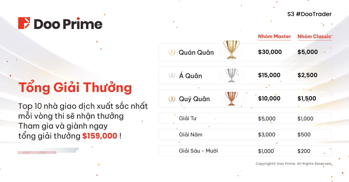 Vòng đầu tiên của Cuộc Thi Tranh Cúp Giao Dịch Toàn Cầu #DooTrader mùa 3 đã kết thúc thành công tốt đẹp. Vòng 2 sẽ chính thức khởi động vào ngay sau đó – tức ngày 7 tháng 11 năm 2022. Bất kể bạn là thí sinh mới hay đã là nhà giao dịch tham gia vòng đầu tiên, Doo Prime đều hoan nghênh bạn đến với Vòng 2 của DooTrader. Với tổng giá trị giải thưởng 159,000 USD, chúng tôi rất mong sẽ được chứng kiến những màn thi đấu đỉnh cao từ các người chơi.
